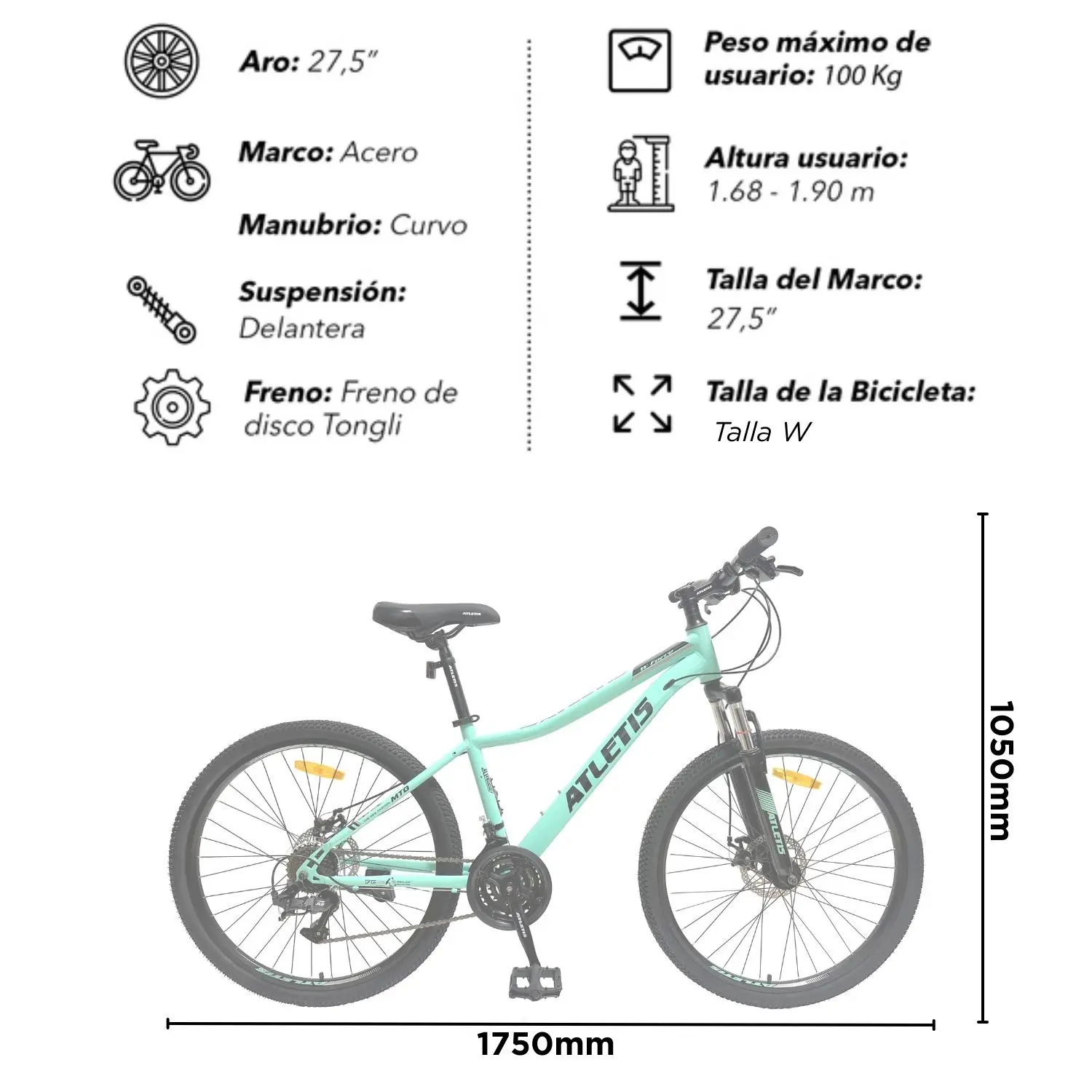 La Bicicleta Mountain Bike Atletis W Force aro 27.5 turquesa es una excelente opción para quienes disfrutan andar en distintos tipos de terreno, ya sea en la ciudad o en cerros. Su marco de acero de 27.5” es firme y resistente, mientras que su suspensión delantera ayuda a absorber los golpes, haciéndola más cómoda en caminos con baches o piedras.