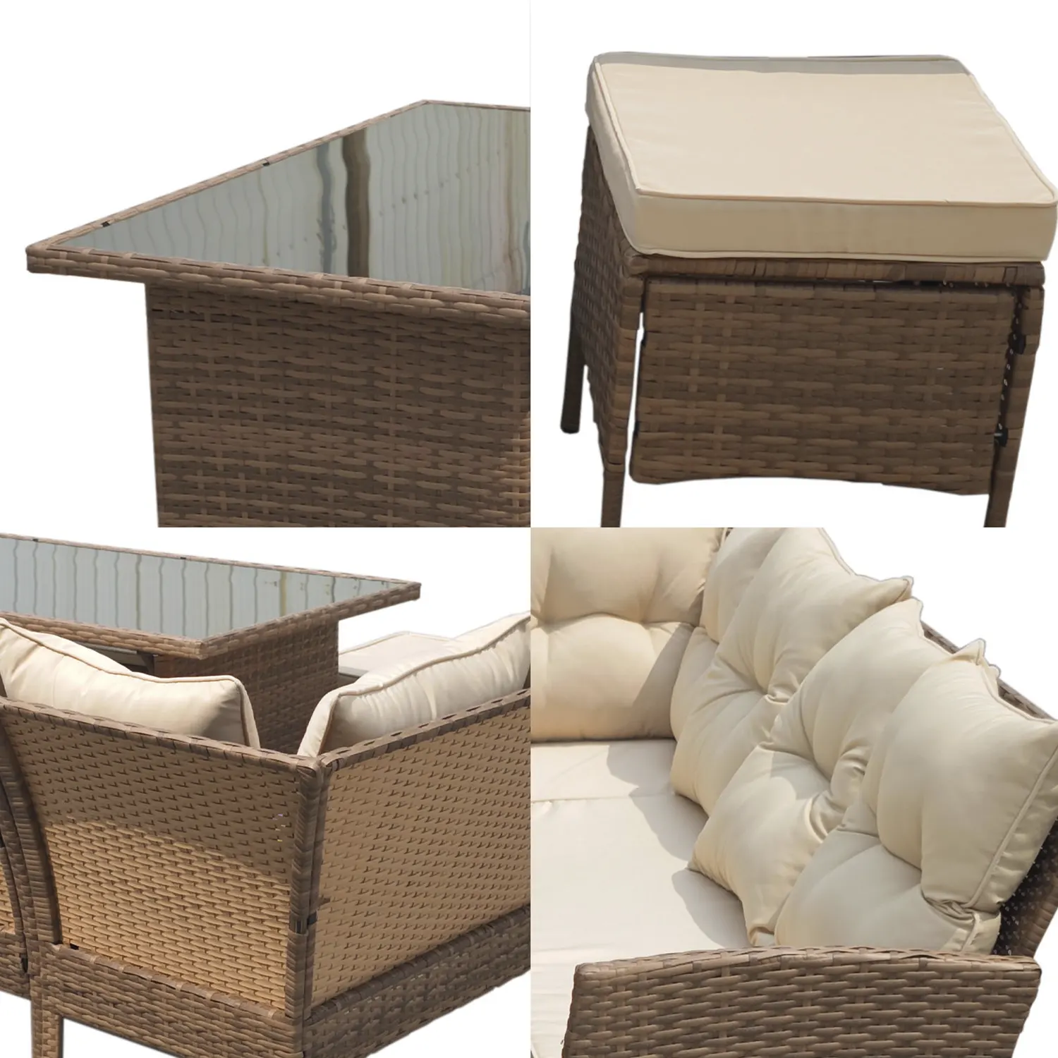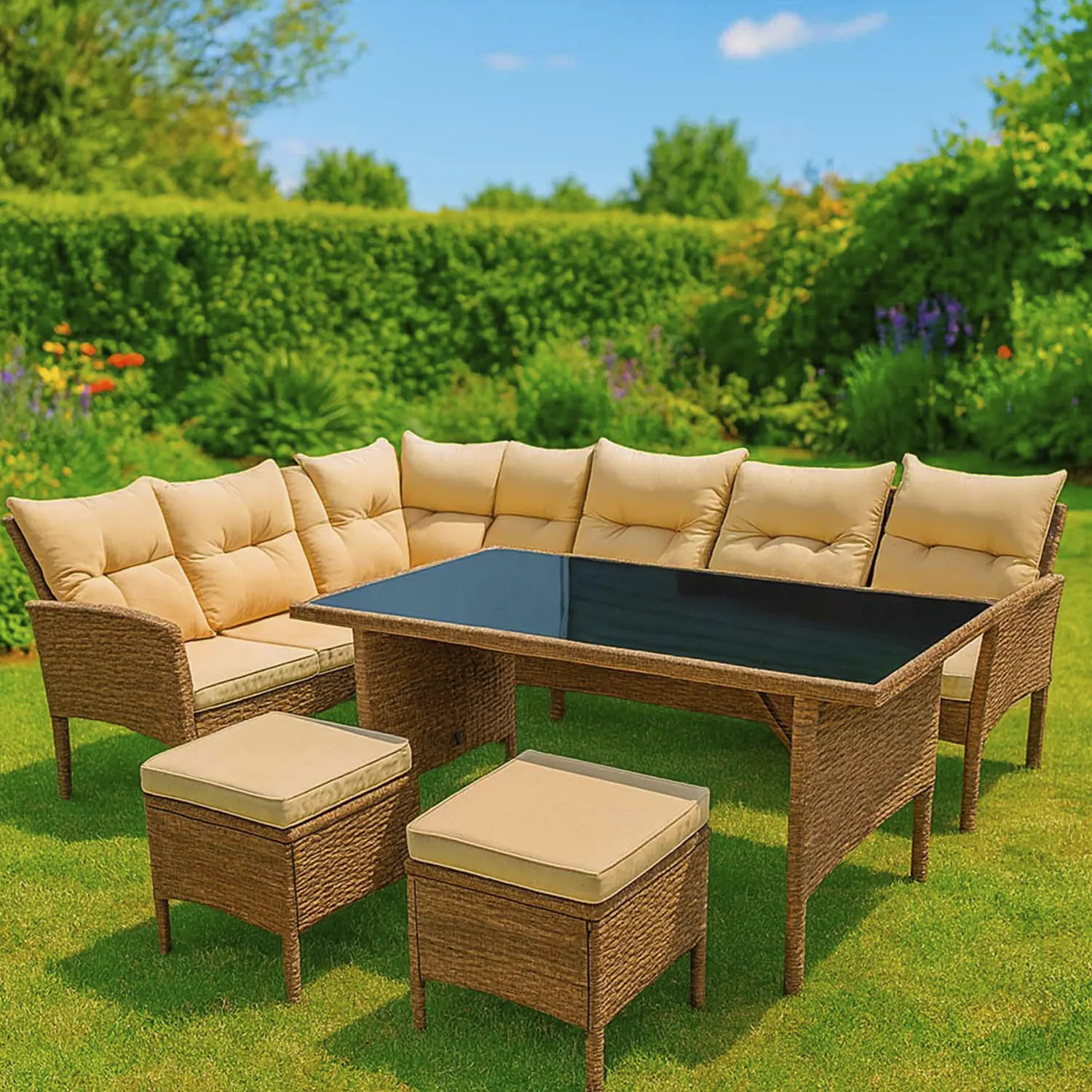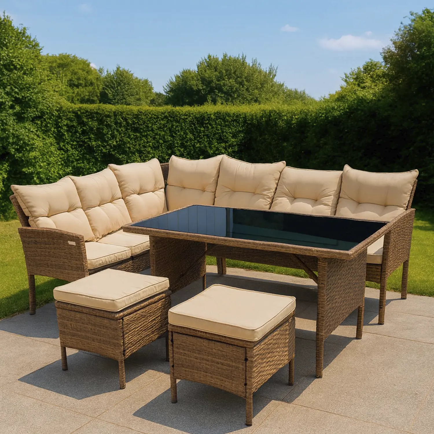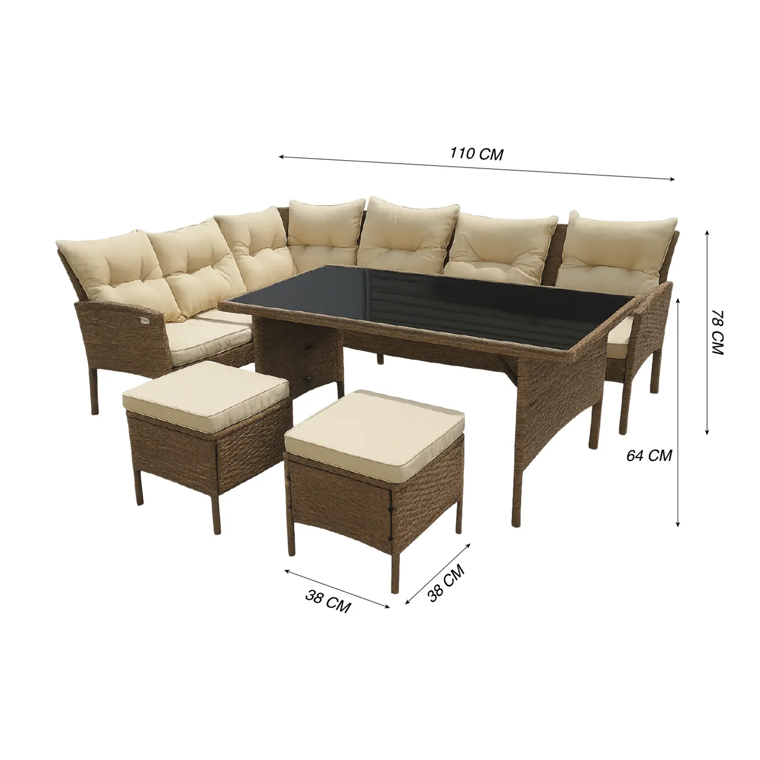 Este juego de comedor para terraza está diseñado para disfrutar de reuniones familiares, celebraciones y tardes de descanso. Los cojines acolchados brindan comodidad, mientras que la estructura de acero galvanizado garantiza resistencia y durabilidad frente al uso diario y condiciones exteriores. La mesa con cubierta de vidrio templado aporta elegancia y practicidad para servir comidas o bebidas. Los taburetes adicionales ofrecen versatilidad, sumando más asientos sin ocupar demasiado espacio.