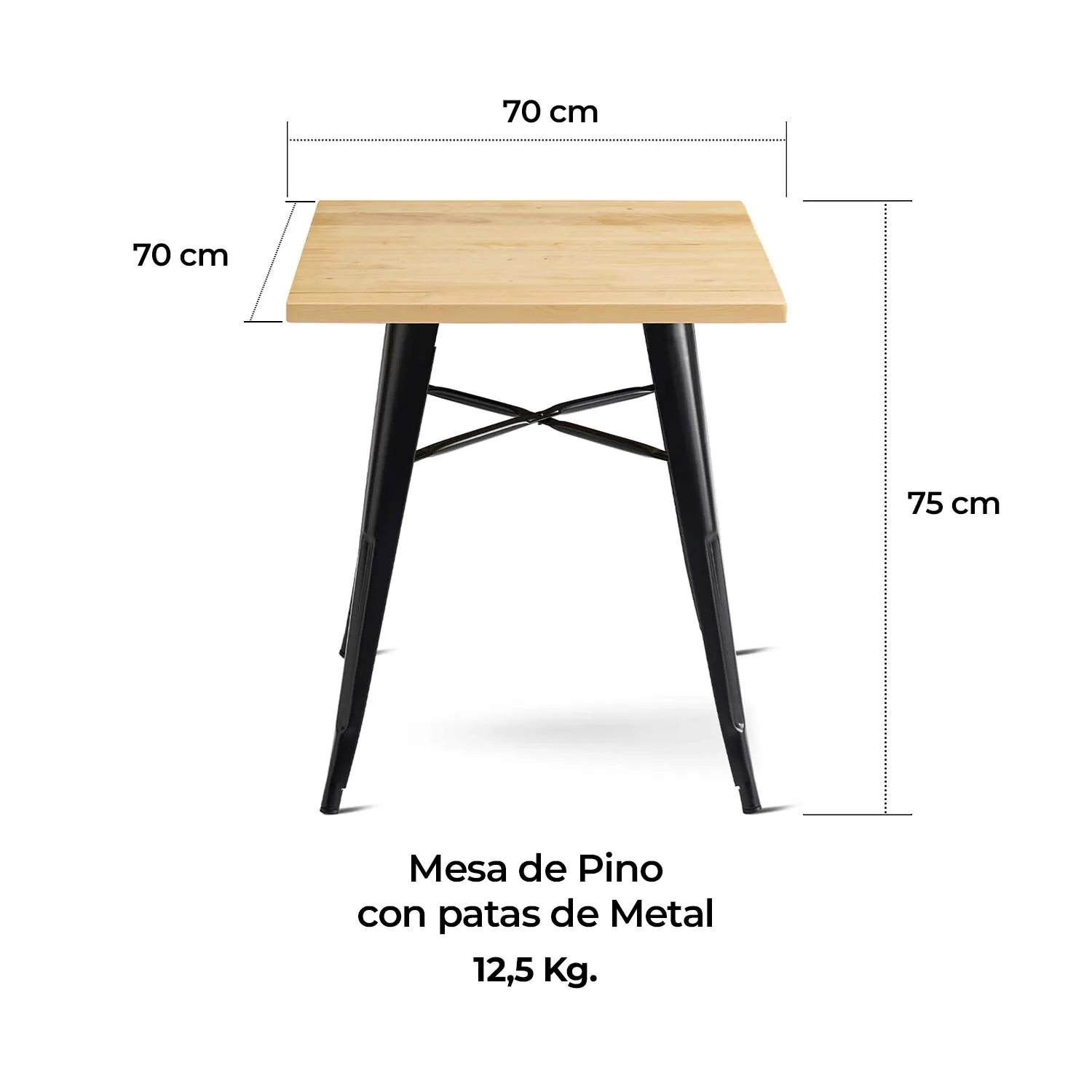 Esta mesa se adapta fácilmente a distintos ambientes gracias a su estilo moderno y su estructura firme. Su superficie de pino ofrece una apariencia natural y elegante, mientras que sus patas metálicas brindan estabilidad. Puede utilizarse para trabajo, estudio, comidas o reuniones sociales. Su tamaño compacto permite ubicarla en espacios reducidos sin perder comodidad. El montaje es rápido y accesible, lo que facilita su instalación en el hogar o en espacios comerciales. La Mesa Metal Tolix cubierta Madera 70×70 cm ofrece una combinación equilibrada entre diseño, resistencia y comodidad. Con cubierta de pino, base metálica y un tamaño práctico, es una opción atractiva y funcional para interiores y terrazas techadas.