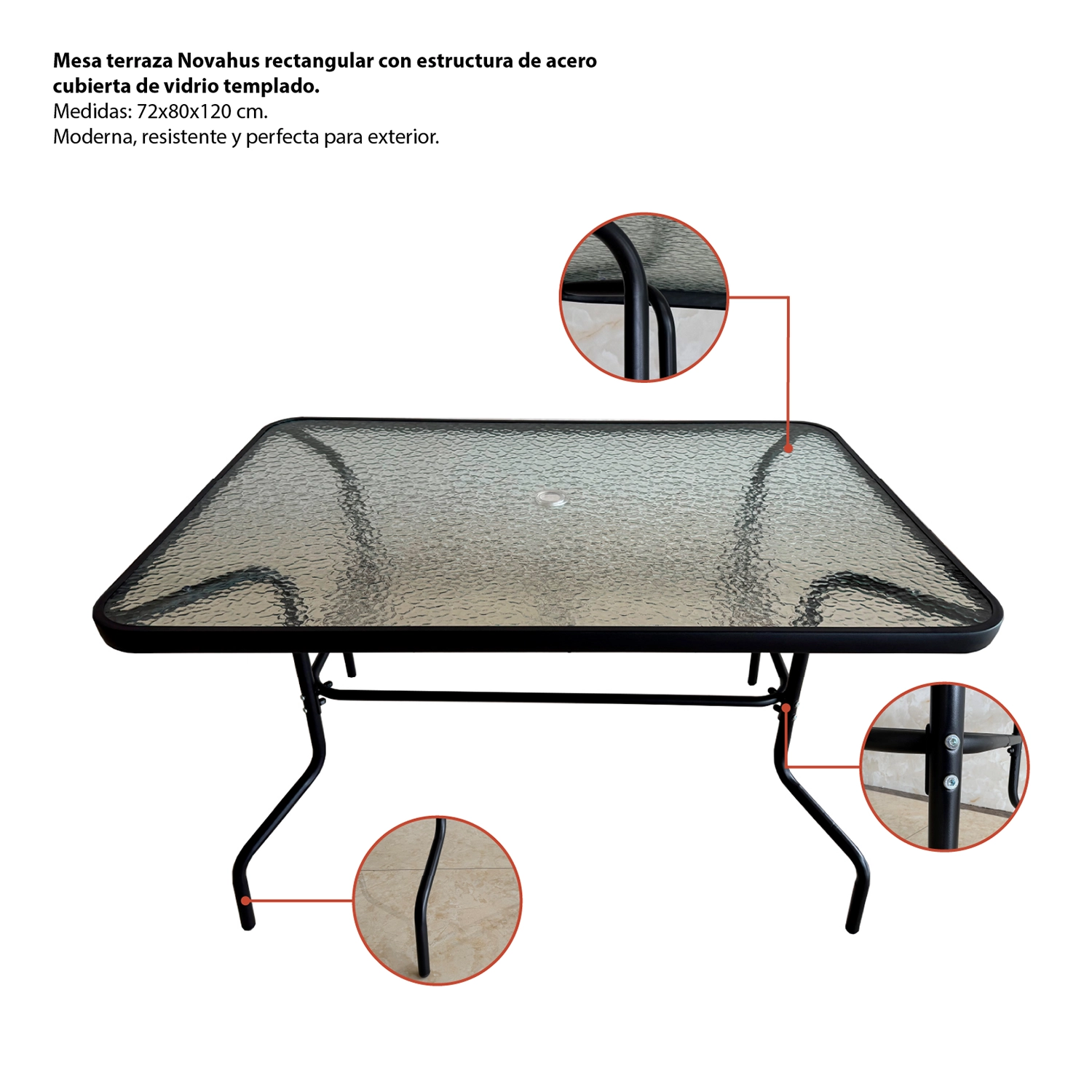 La Mesa Terraza Novahus rectangular con cubierta de vidrio templado y estructura de acero es la opción ideal para quienes buscan funcionalidad y elegancia en ambientes exteriores. Sólida, moderna y versátil, es perfecta para disfrutar de tu terraza con comodidad y estilo.