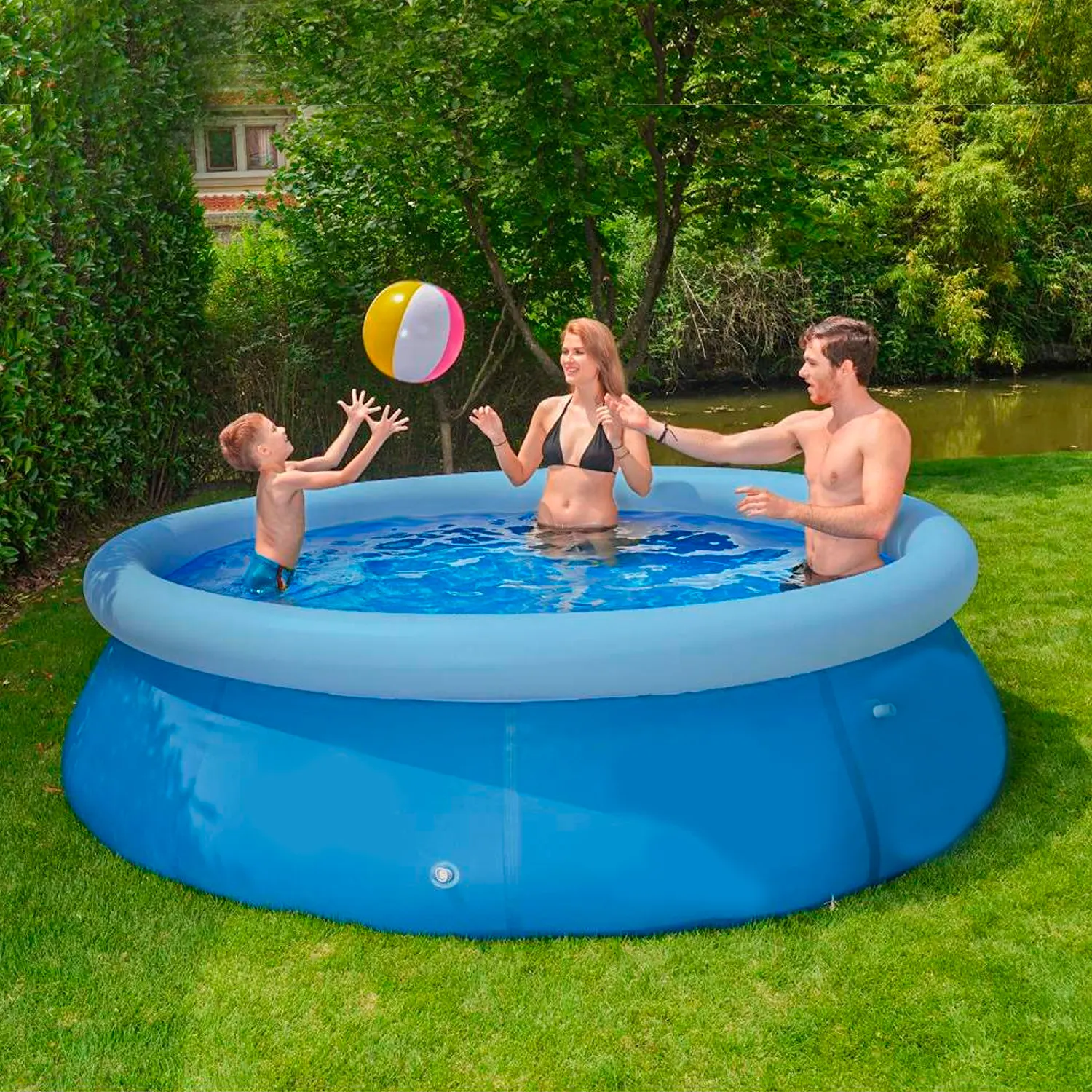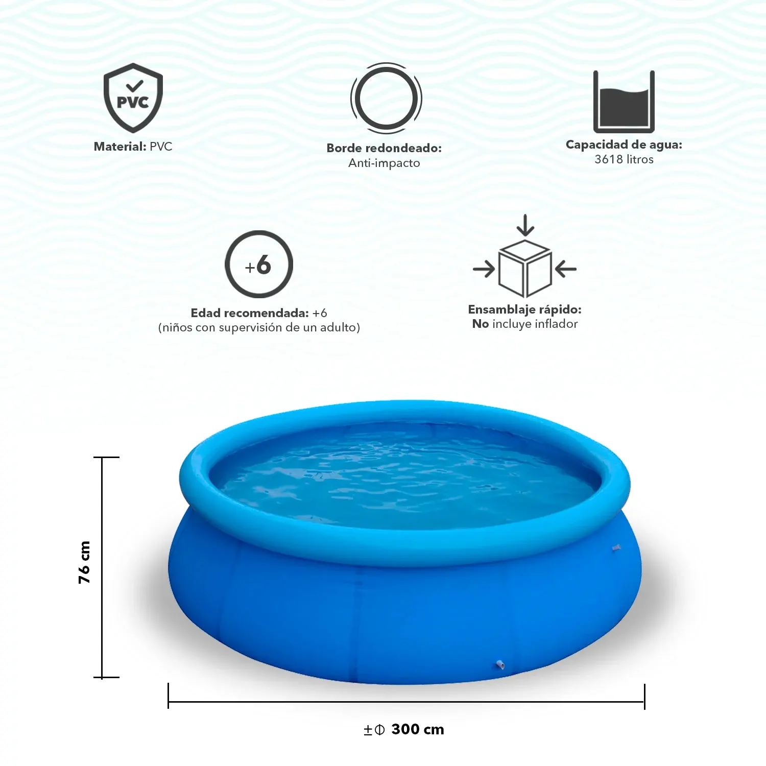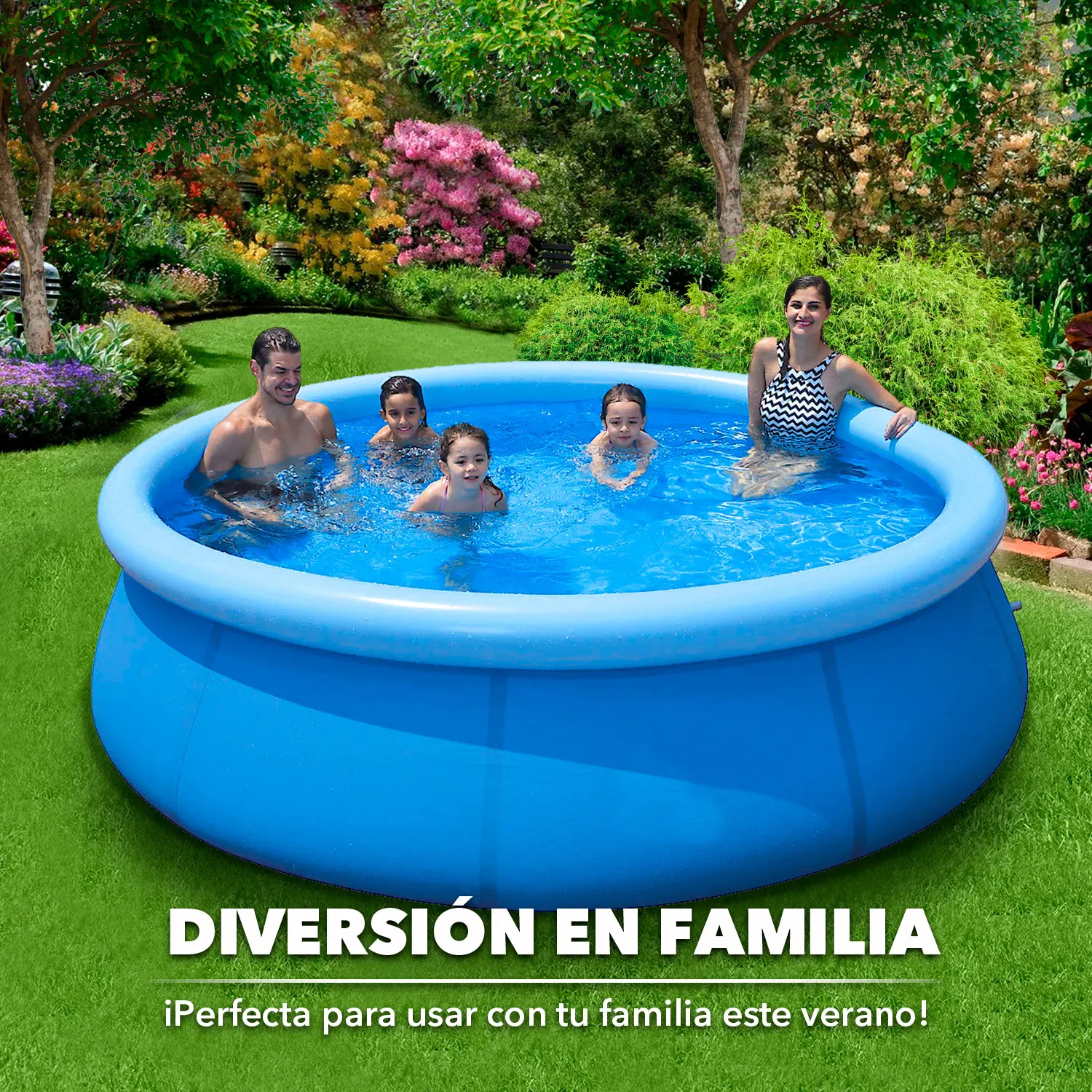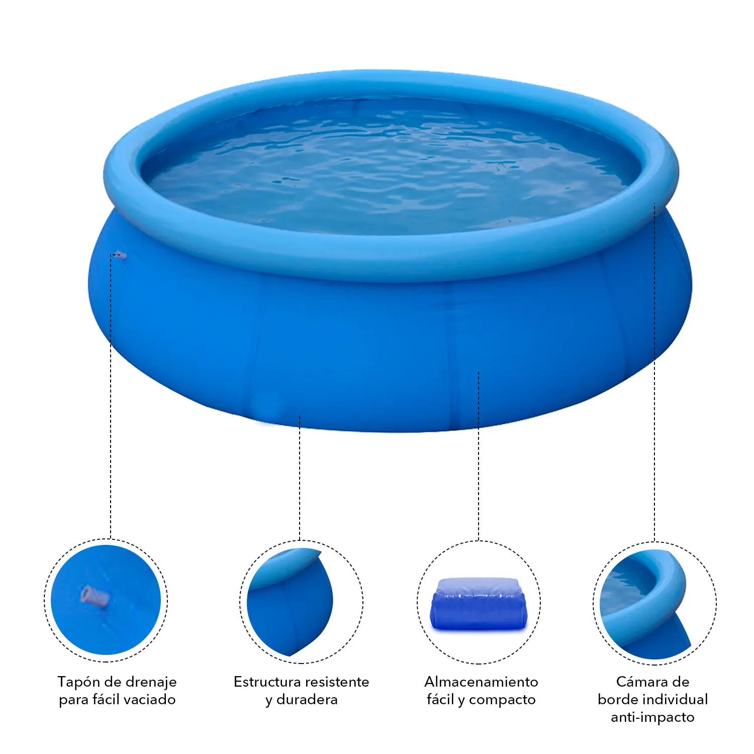 Con un diámetro de 360 cm y una altura de 76 cm, esta piscina es lo suficientemente amplia para que niños y adultos disfruten juntos. Incluye un tapón de drenaje que facilita el vaciado y la limpieza, ahorrando tiempo y esfuerzo. Además, gracias a su estructura inflable, se arma de manera sencilla y rápida, siendo perfecta para jardines o patios de diferentes tamaños.