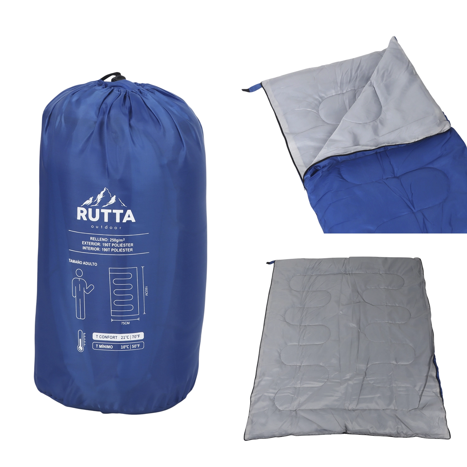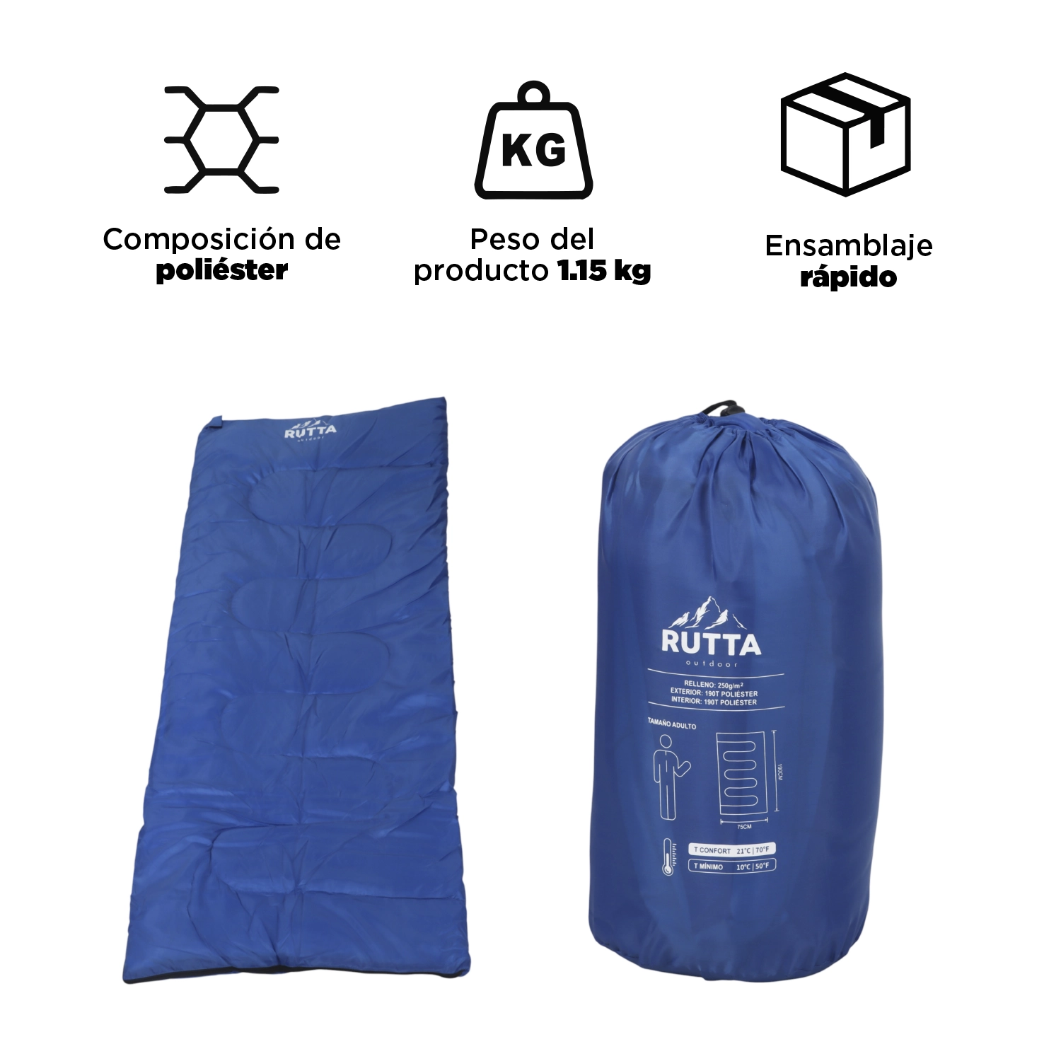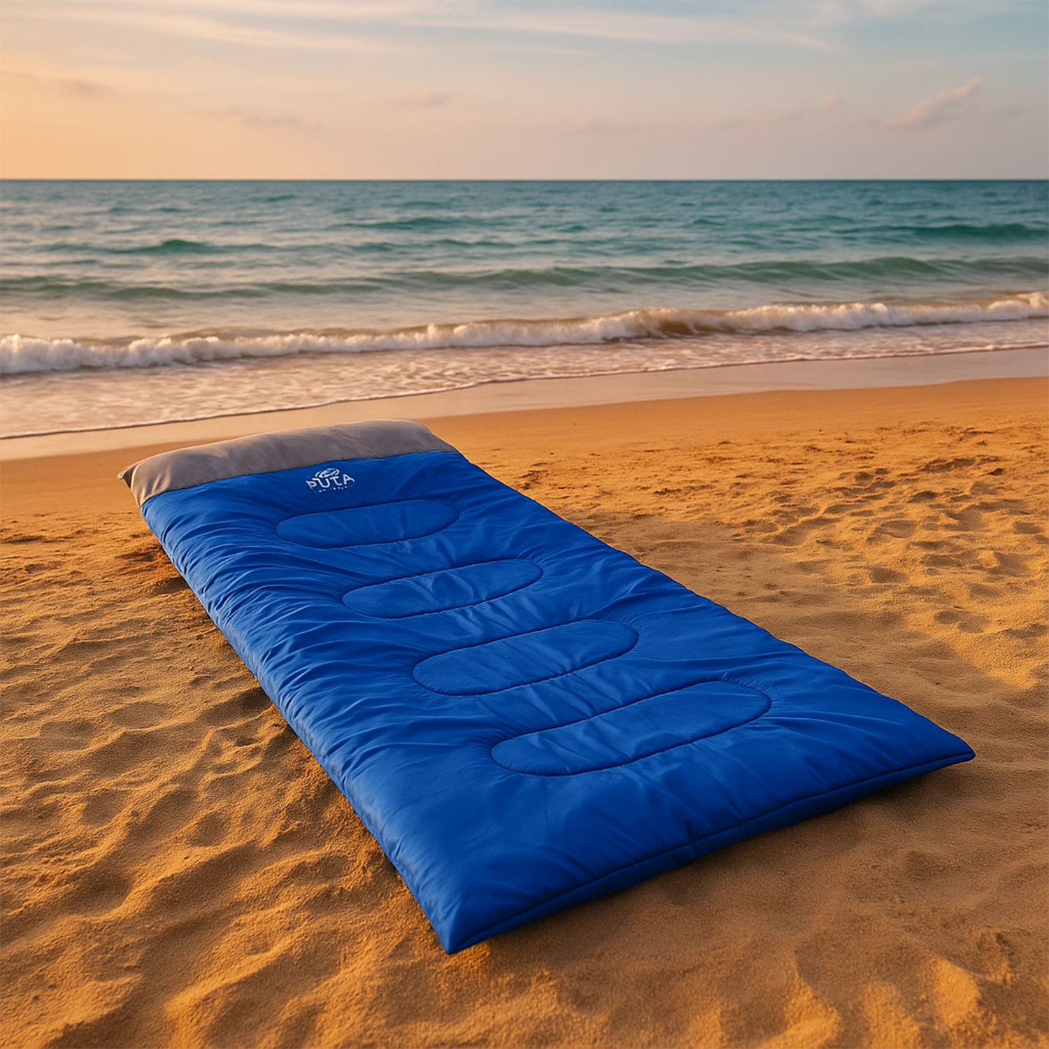 El Saco de Dormir 250 gr Azul es una opción ligera, práctica y cómoda para tus aventuras al aire libre en verano y otoño. Su diseño rectangular brinda mayor amplitud y libertad de movimiento, ideal para quienes prefieren un descanso sin restricciones.