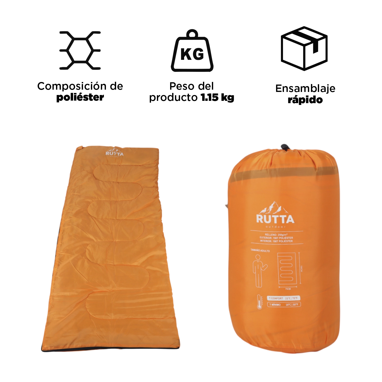 El Saco de Dormir 250 gr Naranjo es la opción práctica y ligera para quienes disfrutan del camping y las excursiones en verano y otoño. Su diseño rectangular ofrece mayor libertad de movimiento y comodidad al dormir, siendo ideal para quienes prefieren espacio extra dentro del saco.
