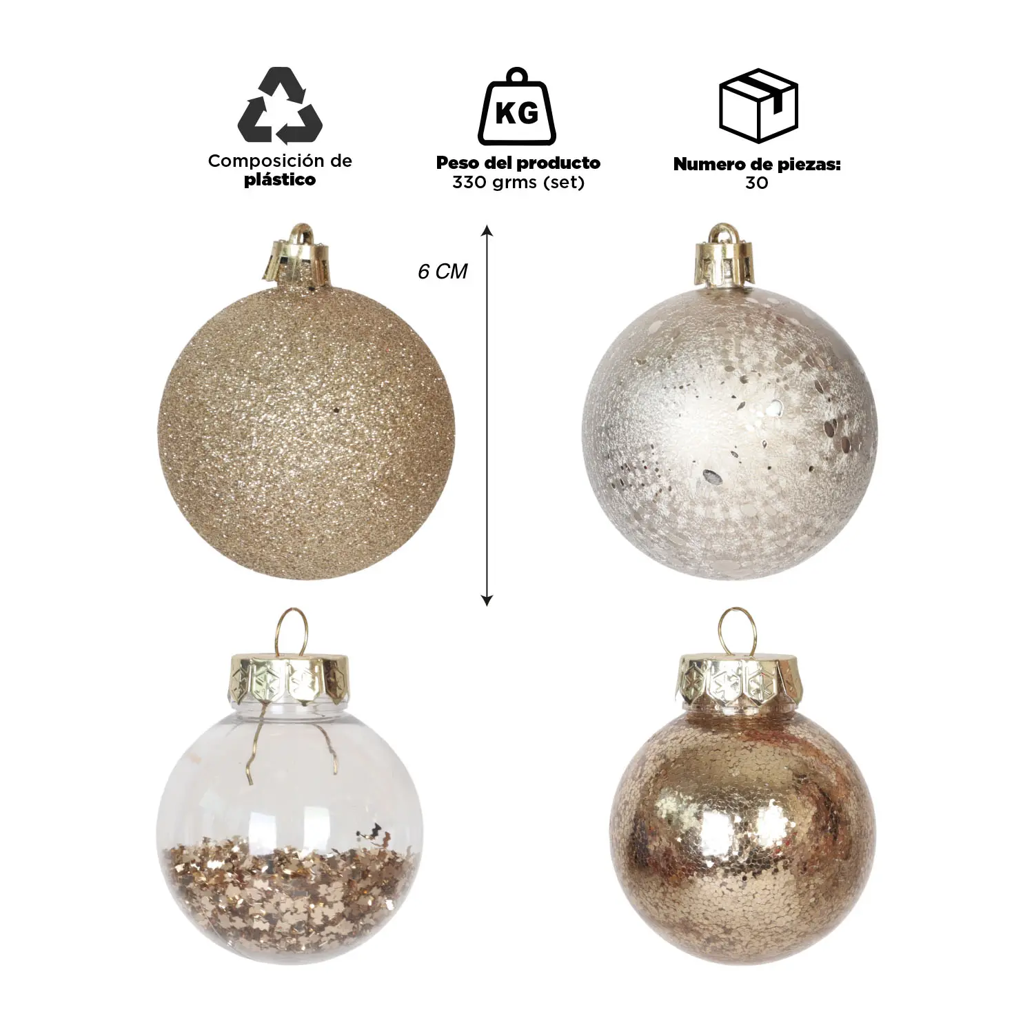 El Set 30 Esferas Navidad Dorado de Inspiracci es el complemento perfecto para llenar tu árbol de brillo y color. Cada esfera está cuidadosamente diseñada para reflejar la luz de las guirnaldas y añadir un toque de elegancia a la decoración. Sus acabados brillantes y texturas variadas crean un efecto visual armonioso que captura la esencia festiva.