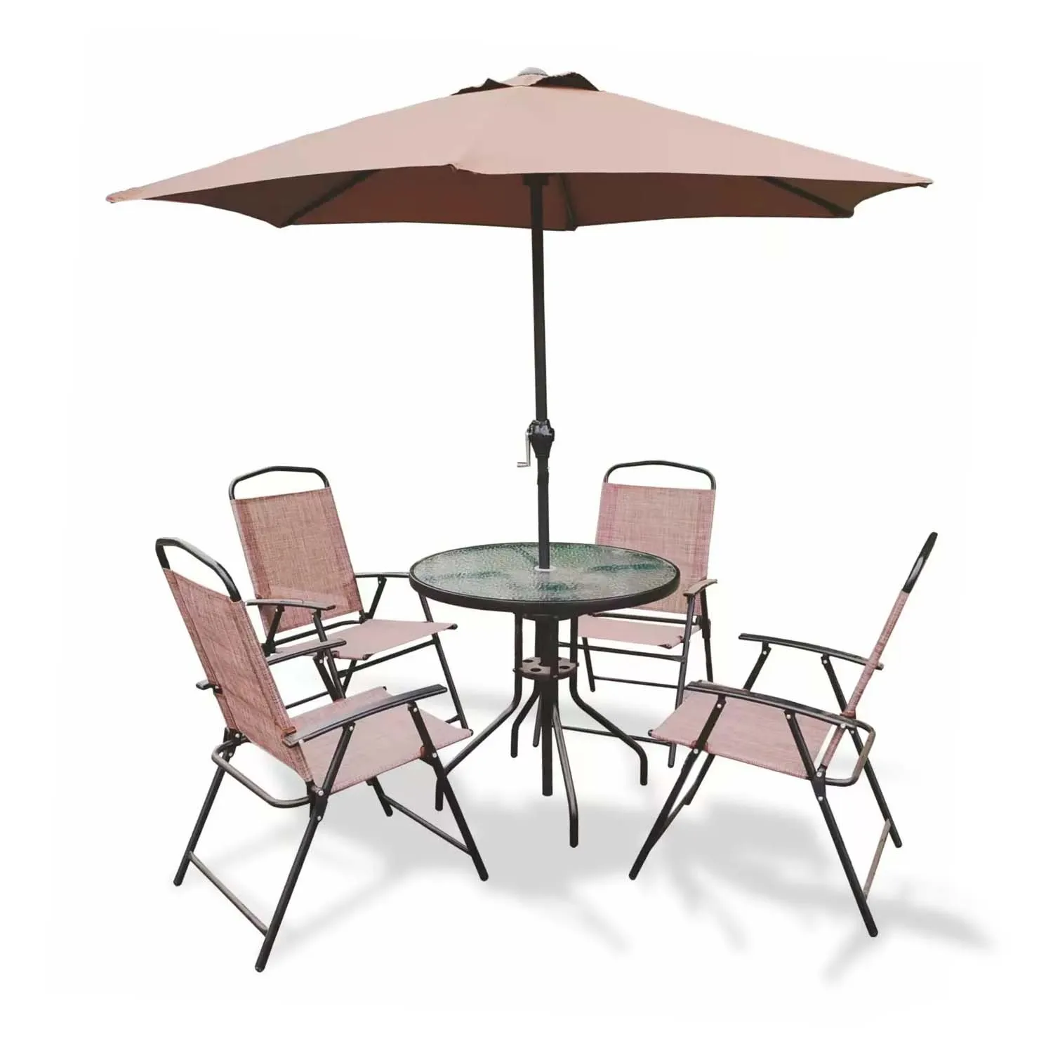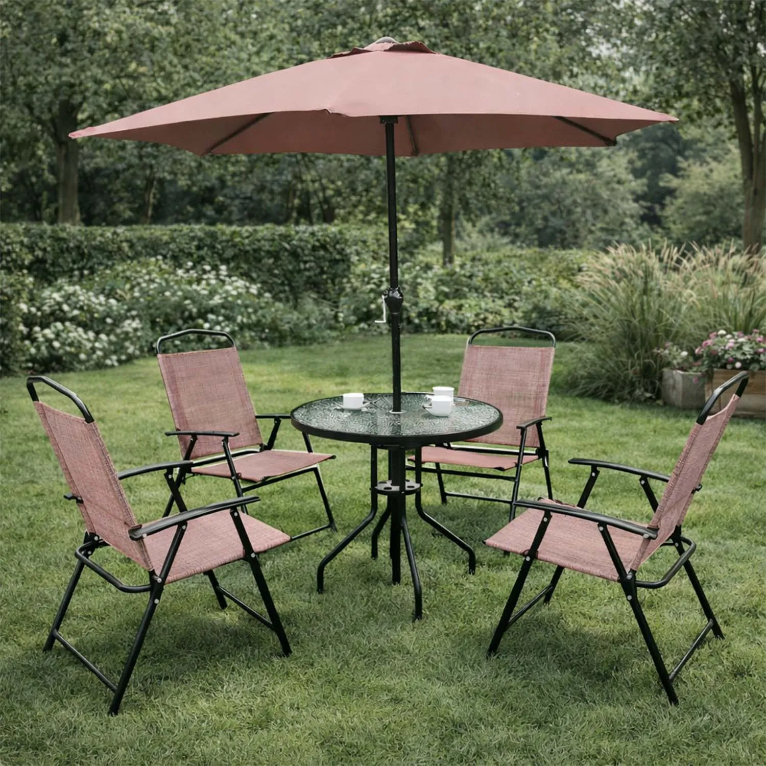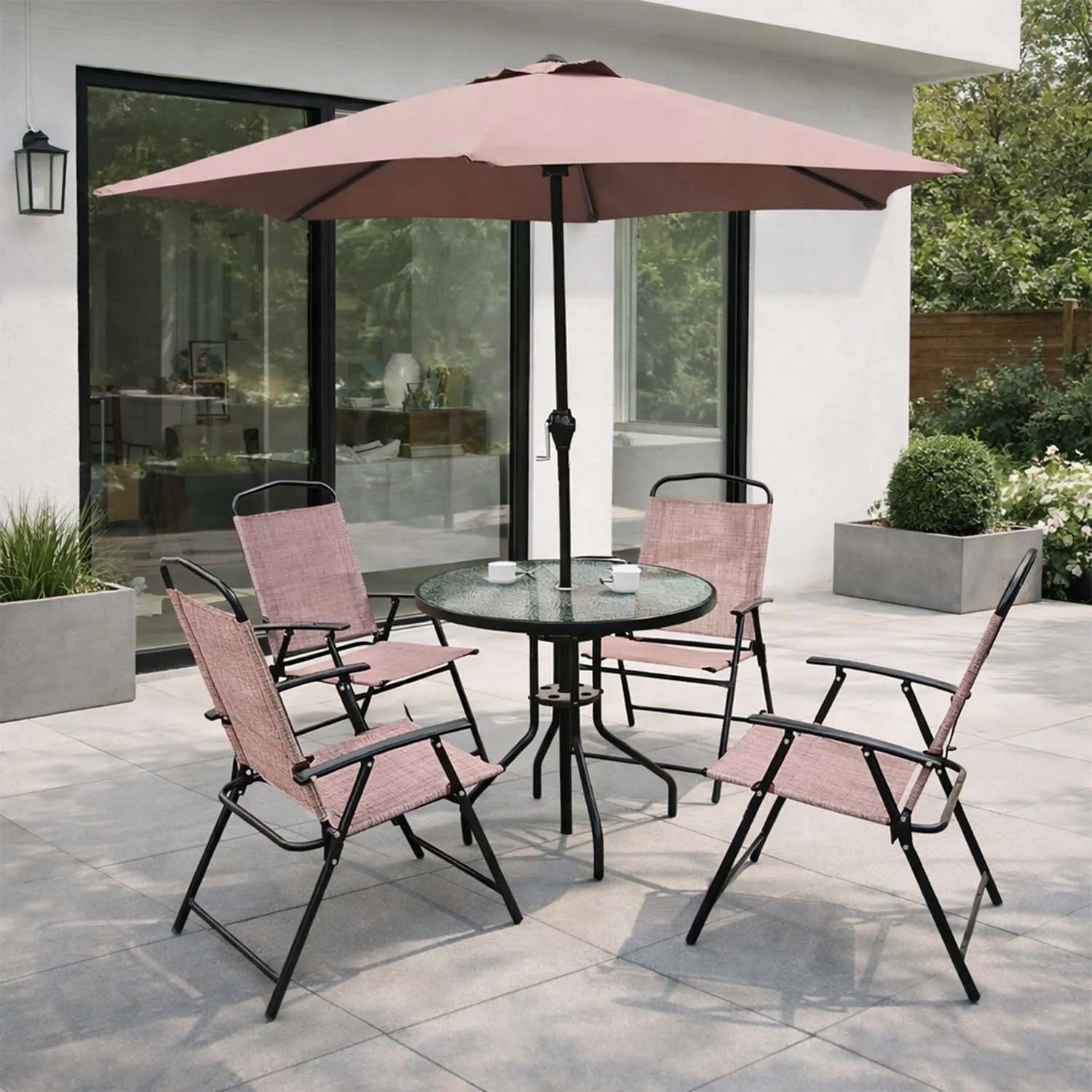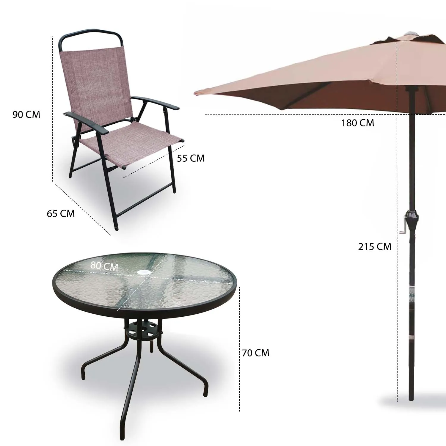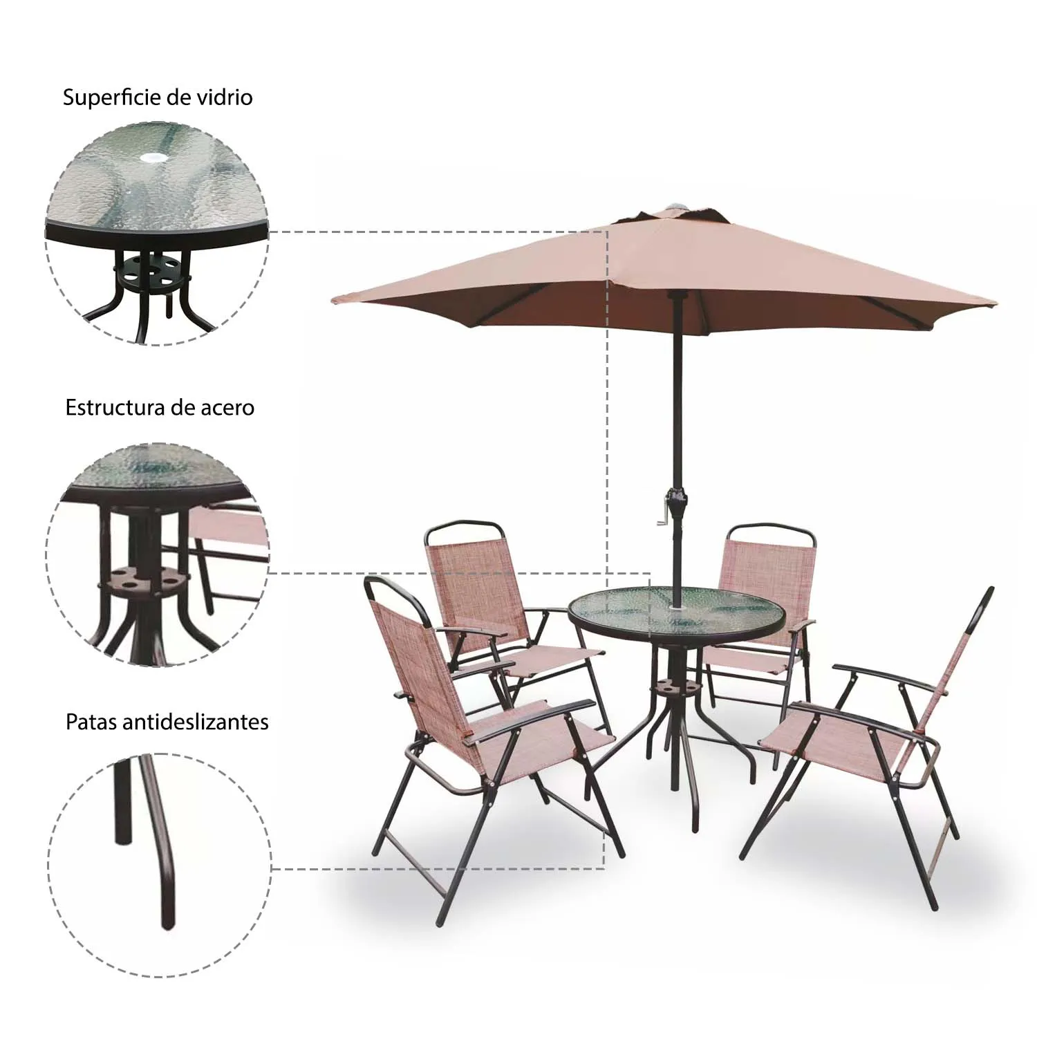 El set Recife ofrece comodidad y practicidad para el día a día. Sus sillas plegables facilitan el guardado y transporte, mientras que la mesa de vidrio templado es resistente y fácil de limpiar. El quitasol permite disfrutar de tardes más frescas y protegidas del sol. Es un conjunto ideal para terrazas, patios pequeños o balcones, aprovechando al máximo el espacio sin sacrificar estilo.