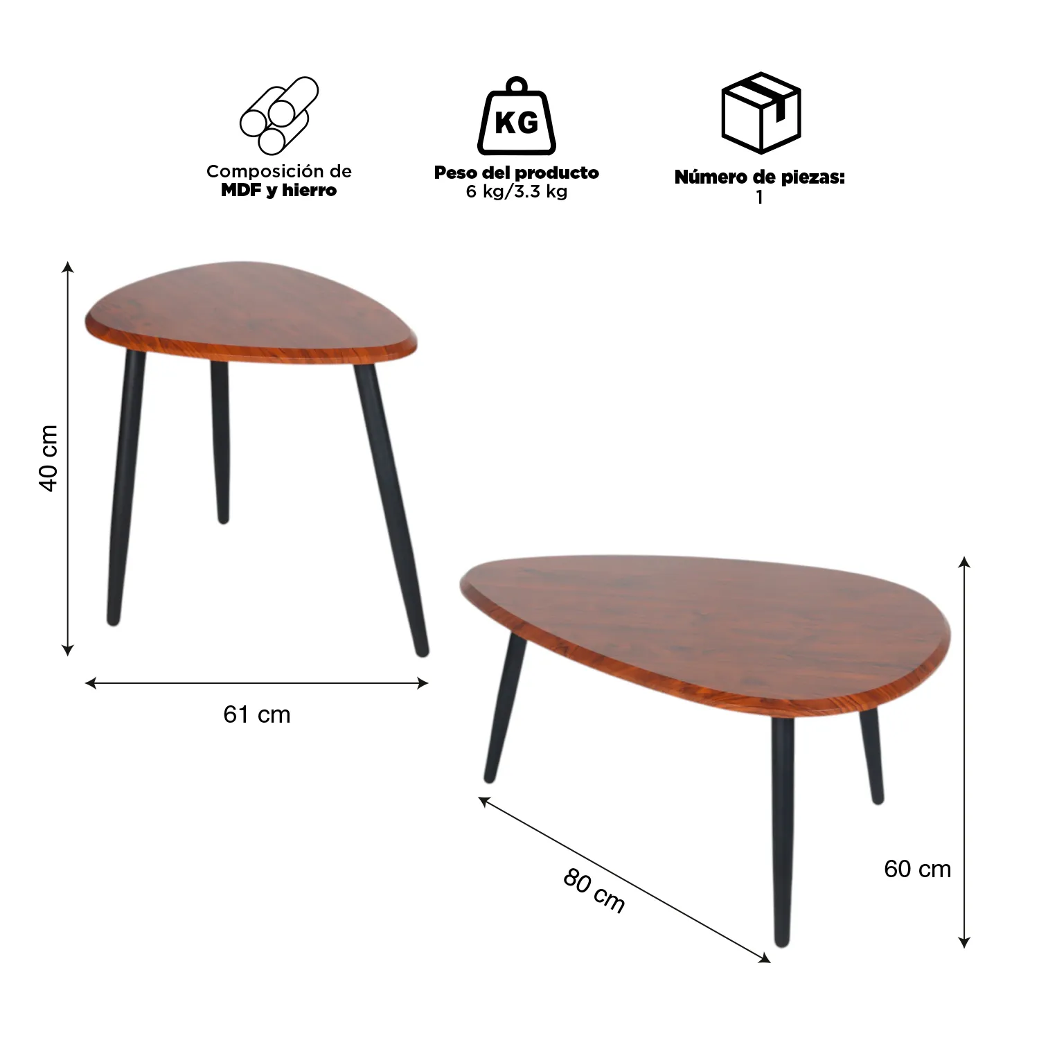 Mesa 1: Altura 47 cm, Ancho 60 cm, Largo 80 cm