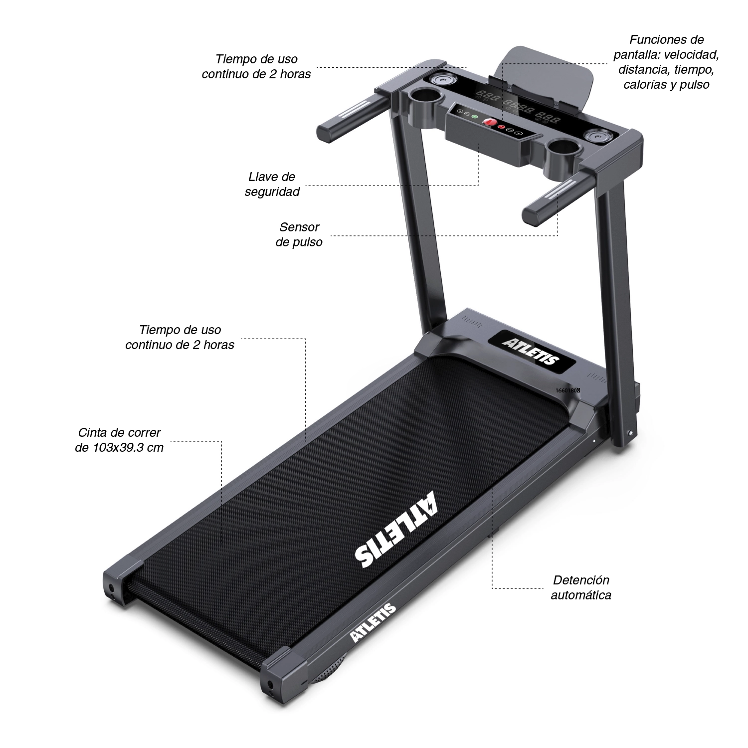 Fabricada en acero y plástico resistente, soporta hasta 100 kg de usuario, garantizando estabilidad y durabilidad. Incorpora una pantalla LED de 50×248 mm que muestra en tiempo real velocidad, distancia, tiempo, calorías y pulso gracias a su sensor integrado. Además, cuenta con 12 programas automáticos y 3 modos de cuenta regresiva para variar la intensidad de tus entrenamientos.